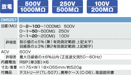 | 本器は定格電圧500V、250V、100Vの印加電圧3レンジ式の絶縁抵抗計(jì)です。パワーオンとパワーロックが可能な2段式プッシュスイッチを採用。測(cè)定後、充電された電圧を放電するディスチャージ機(jī)能付きです。內(nèi)蔵電池の電池容量が簡(jiǎn)単に測(cè)れるインナーバッテリチェック機(jī)能を搭載しました。 ● 耐衝撃デザイン ● 充電された電圧を放電するディスチャージ機(jī)能 ● パワーオンとパワーロックが可能な2段式プッシュスイッチ ● パワーオンがLEDで確認(rèn)できる高圧発生インジケータ ● インナーバッテリチェック機(jī)能 ● 活線狀況を見極められる交流電圧測(cè)定機(jī)能 ● 印加電圧3レンジ切換式 |