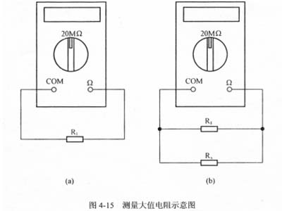 預先準備一只十幾兆歐的電阻R1,將數(shù)字萬用表撥至20MΩ檔后測出電阻值R1,如圖4-15(a)所示。然后把被測電阻Rx并聯(lián)在R1兩端,再測出并聯(lián)總電阻R,如圖4-15(b)所示。