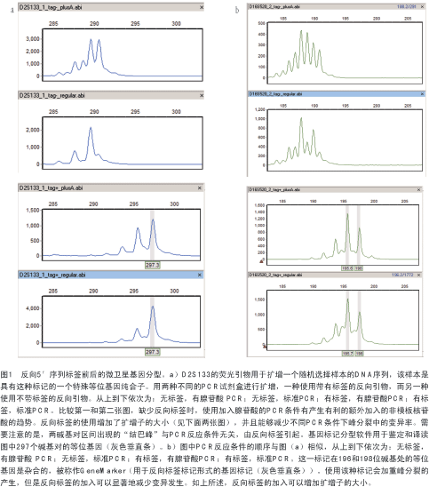 作者已經(jīng)用特異添加腺苷酸的PCR和普通的標準PCR實驗證實了這種序列標簽的有效性。如圖1a和b所示,兩種不同雙核苷酸標記物的差異在于:當使用默認設(shè)計的引物時,其對所用PCR試劑盒的敏感性不同?墒牵绻谖礃擞浺镏屑尤5′標簽則可以減少兩種標記物的變異,從而減少每一種標記物出現(xiàn)問題的幾率。這提示我們:作為一種常規(guī)的防范手段,應(yīng)當在所有常規(guī)的微衛(wèi)星標記中加入這種標簽。