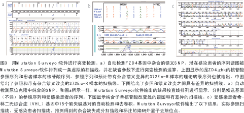 熒光DNA測序的掃描文件通過在ABI 377上進行電泳而獲得。將該文件輸入到Mutation Suveyor軟件中以對序列變異進行分析。廠家的數(shù)據(jù)庫地址或者國立生物技術(shù)信息中心(NCBI)可以提供基因組外顯子/內(nèi)含子和蛋白質(zhì)編碼信息。合成的野生型參照序列(wild-type reference sequence)掃描文件也可通過該軟件由相同的基因組序列產(chǎn)生。