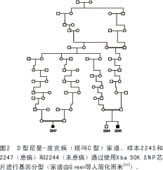 為了比較高通量SNP芯片和微衛(wèi)星標記對家族性遺傳圖譜的有效性,作者利用大量不帶D型隱性尼曼-皮克病的新斯科舍阿卡迪亞家族成員驗證一個已知的遺傳連鎖[9,10]。通過原位克隆鑒定得知潛在的致病基因是NPC1(OMIM#257220)[11],從而在新斯科舍家族患病個體中證實了NCPI存在著純合子突變[12]。作者又利用Xba 50K芯片(Affymetrix公司,圣克拉拉,加拿大)對兩位患病的遠房親屬和一位該家族未患病親屬進行基因分型(見圖2)。如表1所示,兩位患者 18號染色體上相同的等位基因中,具有共享純合性的SNPs的最大拉伸長度約為7.7M堿基對,其中包括圍繞NPC1的位于19.4M堿基對處的71個連續(xù)的SNPs。未患病親屬樣本2244中有30個標記與患病者不一致,某些是雜合子而另一些是其他SNP等位基因的純合子(該數(shù)據(jù)未顯示)。由此可見 SNP芯片可以省時、省力、省錢地成功復(fù)制整個家族樣品的連鎖圖譜。
