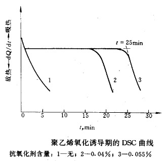 為了防止高聚物的氧化降解作用,通常在高聚物中添加少量的抗氧化劑。至于用什么方法來評價(jià)抗氧化劑的效力是人們關(guān)注的問題。目前普遍采用的方法是利用DSC 或DTA 測定高聚物的氧化誘導(dǎo)期。例如對具有不同含量抗氧化劑的聚乙烯在200 ℃ 和氧氣下進(jìn)行測定,所測得的氧化誘導(dǎo)期是隨著抗氧化劑含量的增大而延長的,如下圖所示。