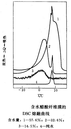 例如利用DSC 對不同含水量的醋酸纖維素膜進(jìn)行測定,如下圖所示。經(jīng)分析,在醋酸纖維素膜中存在著四種狀態(tài)的水:完全游離的水(8 ℃ 附近的陡峰部分)、與膜相互作用很弱的游離水(寬峰部分)、含鹽結(jié)合水(與膜結(jié)合得強(qiáng)的水)和不含鹽的結(jié)合水。
